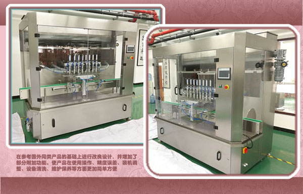 该机集光,机,电,气于一体,采用活塞式定量原理,灌装精度高,操作简单,维护方便,设备主要材质:采用SUS304不锈钢制造,符合卫生要求.灌装过程采用亚克力透明板与外界隔离,保证灌装的卫生要求。灌装采用压力式灌装,无需配装高位罐,简化了安装工序,提高了灌装效率。可广泛应用于食品、酱料行业产品的自动化包装生产。